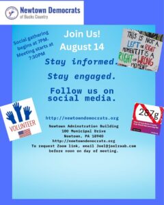 Newtown Democrats Monthly Meeting – August 14th, 2025 7PM (Social Gathering) 7:30 PM (Meeting Start)